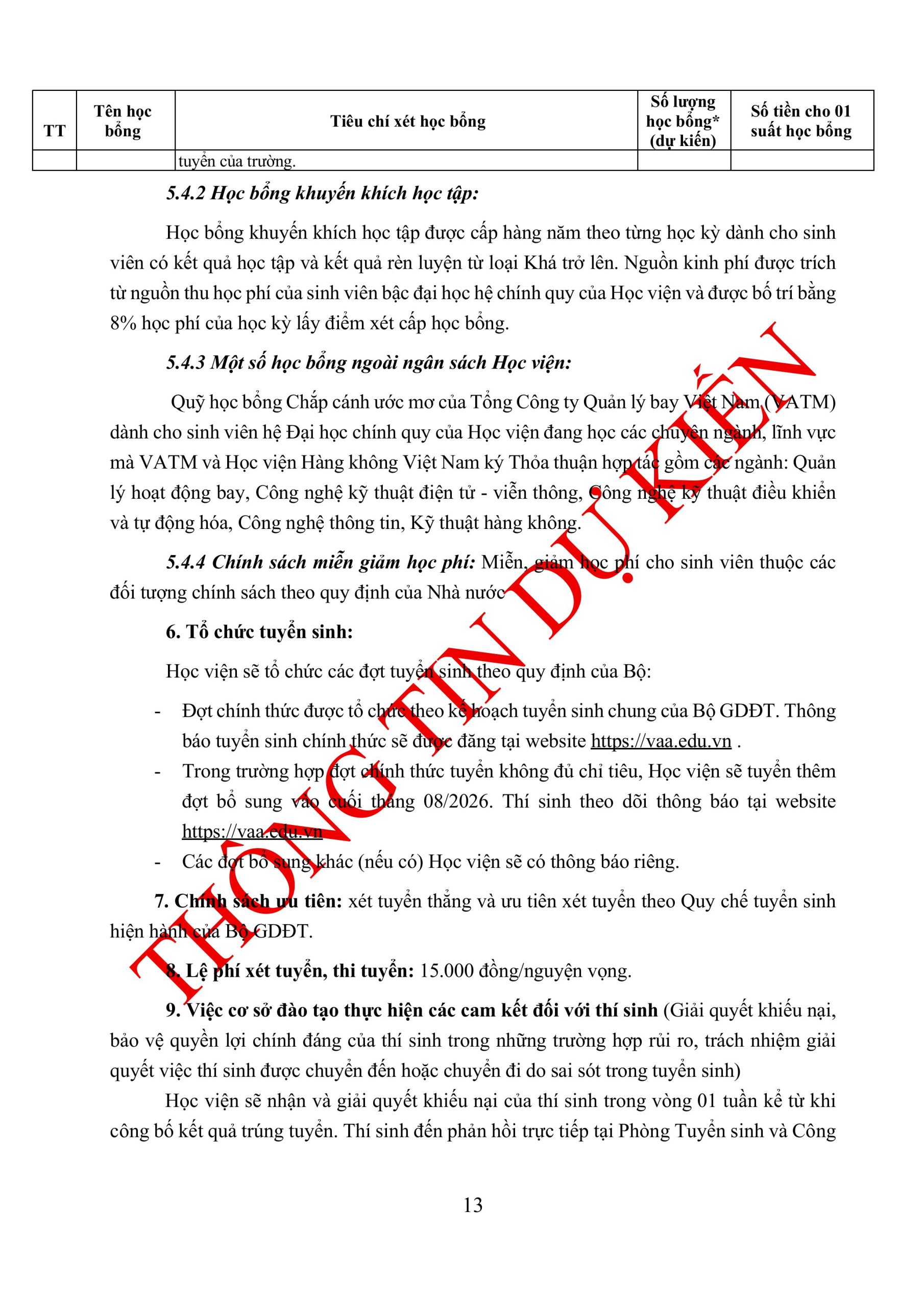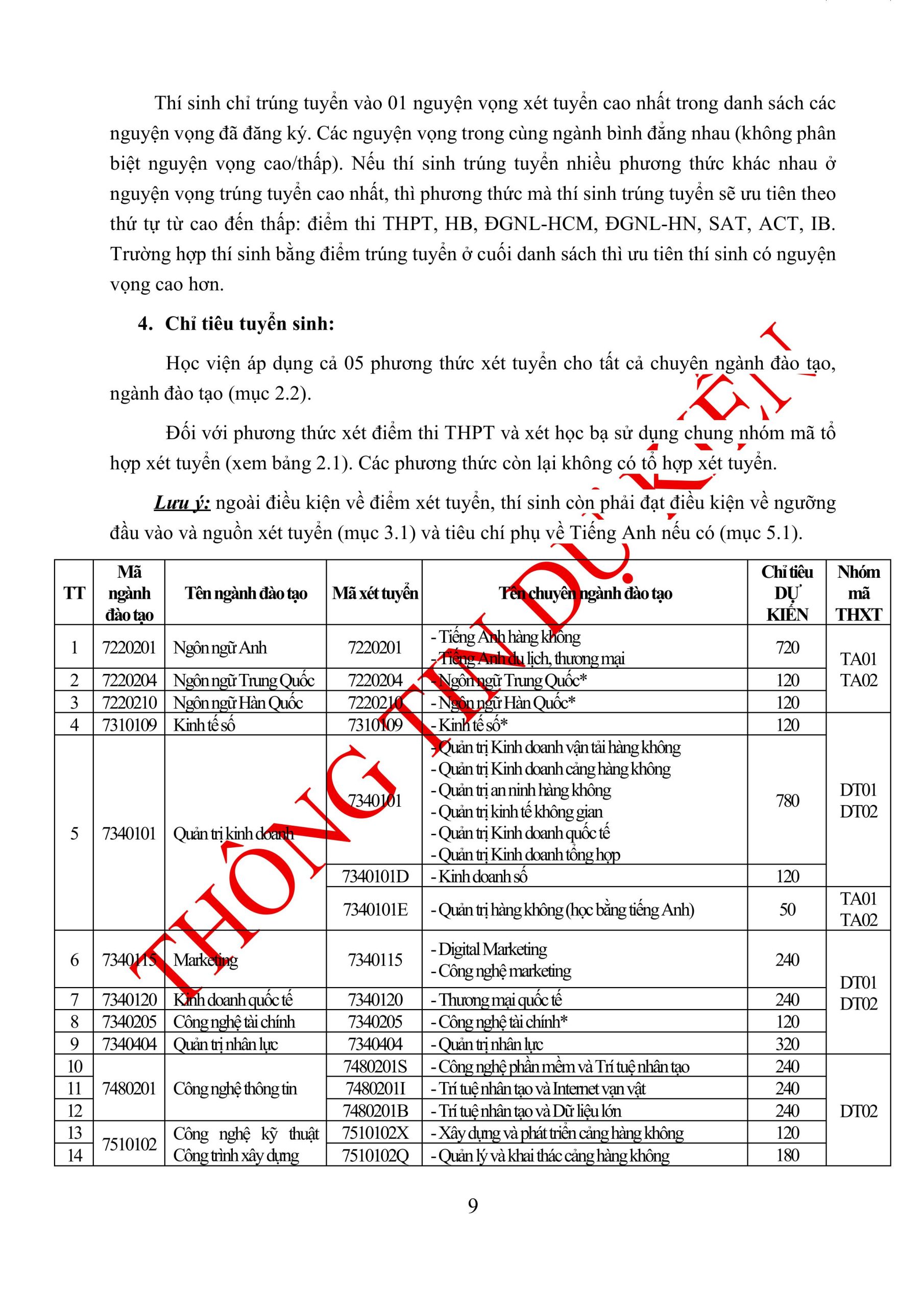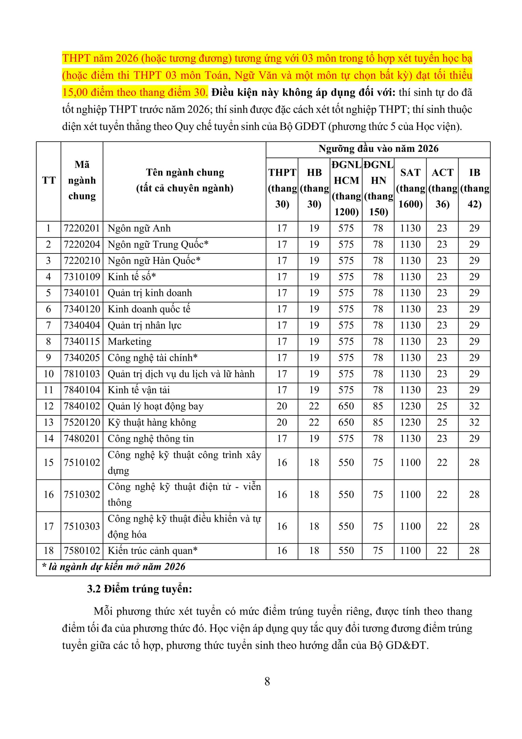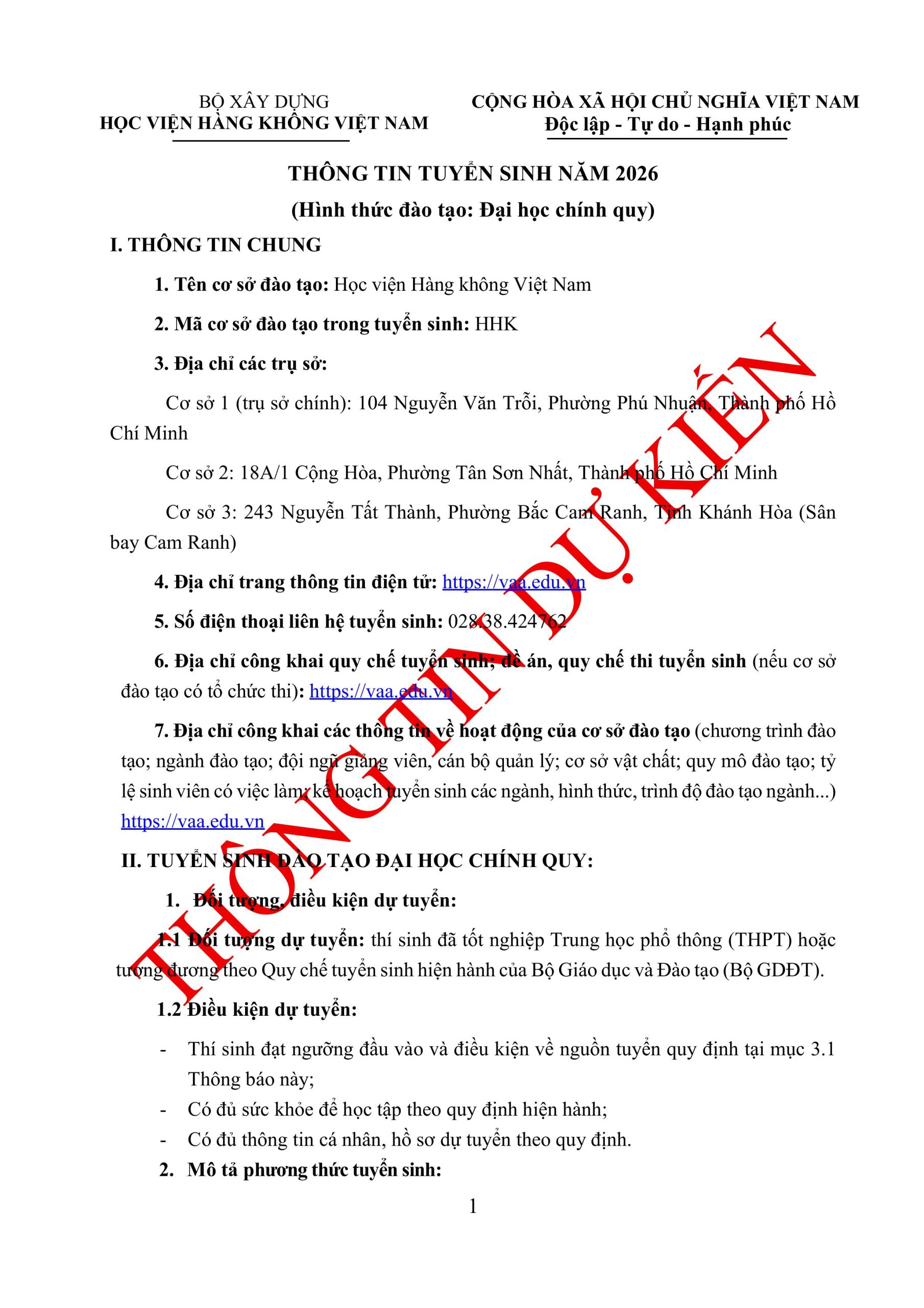 Thông tin tuyển sinh đại học chính quy năm 2026 (DỰ KIẾN) của Học viện Hàng không Việt Nam: